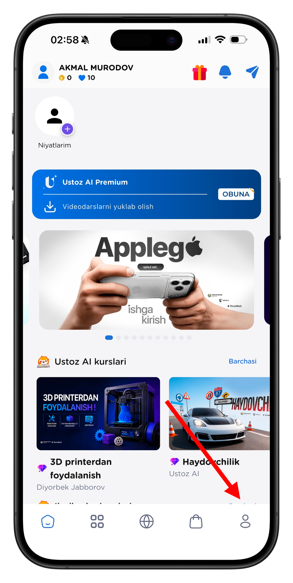 Quyidagi 9 ta oddiy qadamni bajaring va Ustoz AI Premium'dan AKMAL20 / AKMAL10 promokodlari bilan foydalaning.